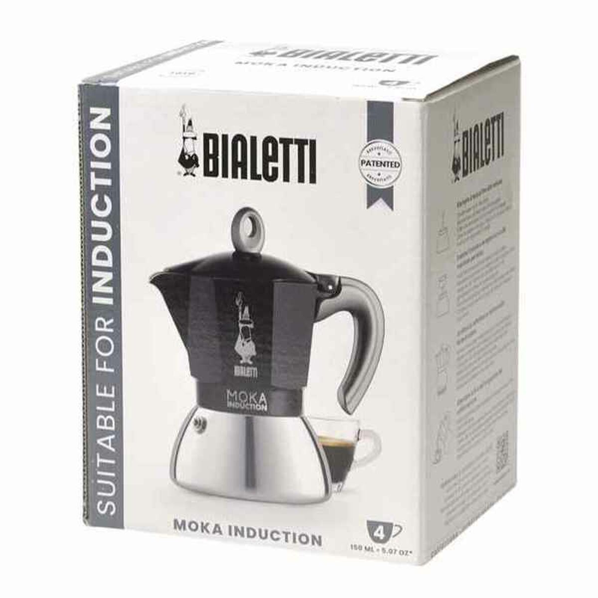 The Bialetti New Moka Induc Black 4-cup Italian coffee maker is a classic design adapted for convenience and functionality in home coffee brewing. Made of aluminium, this material ensures fast heat conduction and outstanding durability, allowing even heat distribution during extraction. Its black finish gives it a modern and elegant look that fits perfectly in any kitchen, while also providing resistance to stains and corrosion. This coffee maker is specially designed as a traditional Italian coffee maker that can be used on gas and induction cooktops, thanks to its design adapted for induction hobs, greatly increasing its versatility across modern kitchen types. With the capacity to brew up to 4 cups of coffee, it is ideal for enjoying an espresso with the characteristic intense flavour and aroma typical of this method, respecting the Italian coffee-making tradition. The Bialetti New Moka features a simple system for easy use and cleaning, making it suitable for both experienced users and those new to Italian-style coffee brewing at home. Its compact and functional design allows for convenient storage without taking up much space. Overall, this coffee maker offers a practical and reliable solution for those seeking to preserve the essence of classic espresso coffee with the quality and guarantee of a historic brand like Bialetti.